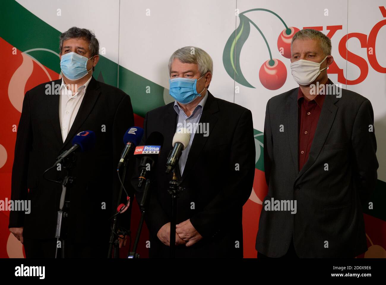 Prague Czech Republic 03rd Oct 2020 L R Kscm First Deputy Chairman Petr Simunek Kscm Chairman Vojtech Filip And Kscm Deputy Chairman Stanislav Grospic Attend The Press Conference After The Regional And Senate